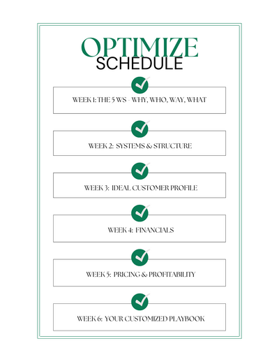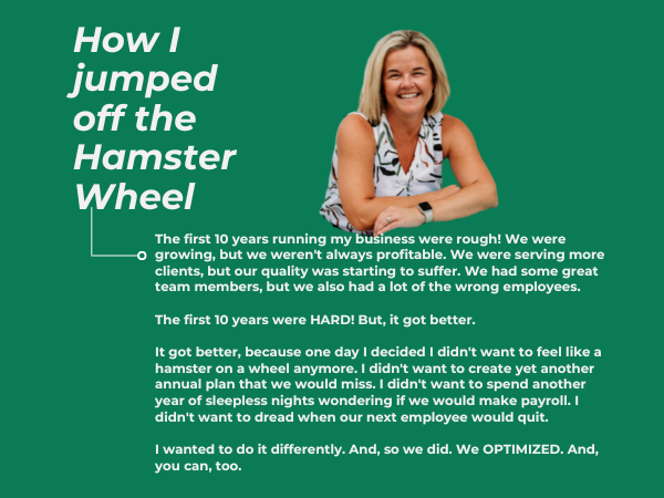"By the end of this program, you'll have a customized playbook in place to run your business without feeling like a hamster on a wheel. Using proven strategies that transformed my own business, you'll see tangible increases to profitability, efficiency, and sustainability."